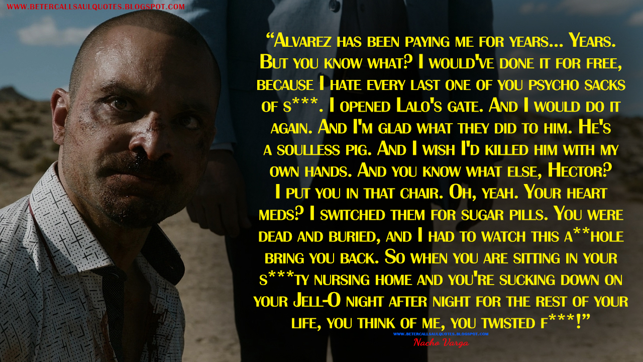 Alvarez has been paying me for years... Years. But you know what? I would've done it for free, because I hate every last one of you psycho sacks of s***. I opened Lalo's gate. And I would do it again. And I'm glad what they did to him. He's a soulless pig. And I wish I'd killed him with my own hands. And you know what else, Hector? I put you in that chair. Oh, yeah. Your heart meds? I switched them for sugar pills. You were dead and buried, and I had to watch this a**hole bring you back. So when you are sitting in your s***ty nursing home and you're sucking down on your Jell-O night after night for the rest of your life, you think of me, you twisted f***!